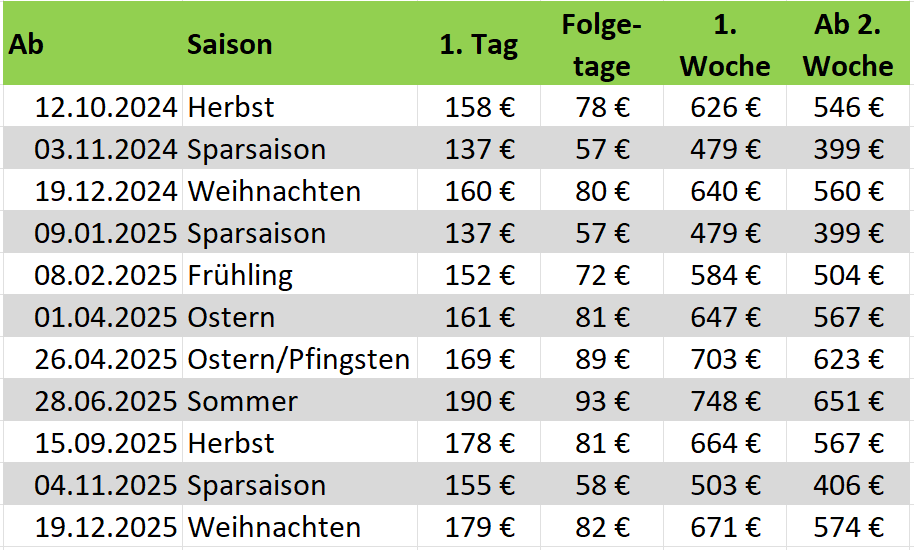 Preise zzgl. Kurtaxe. Ab 3 Pers. Zusatzkosten je Aufenthalt.